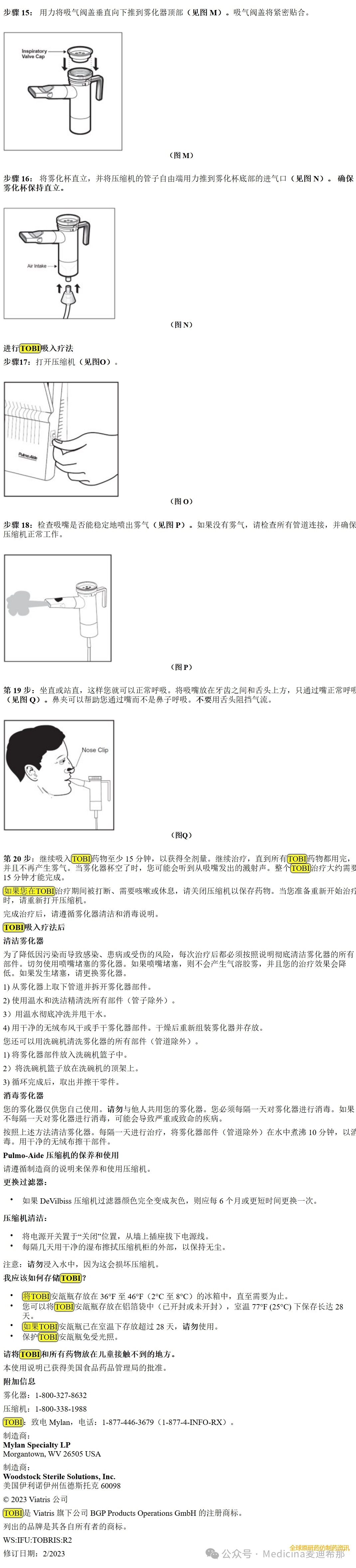 在使用TOBI之前,请阅读TOBI的患者信息/使用说明,了解有关如何使用TOBI的详细信息,并遵循制造商关于 PARI LC PLUS 可重复使用雾化器和 DeVilbiss Pulmo-Aide 空气压缩机的使用和保养说明。患者在坐着或站着并通过雾化器的吸嘴正常呼吸时吸入TOBI。鼻夹可以帮助患者通过嘴呼吸。