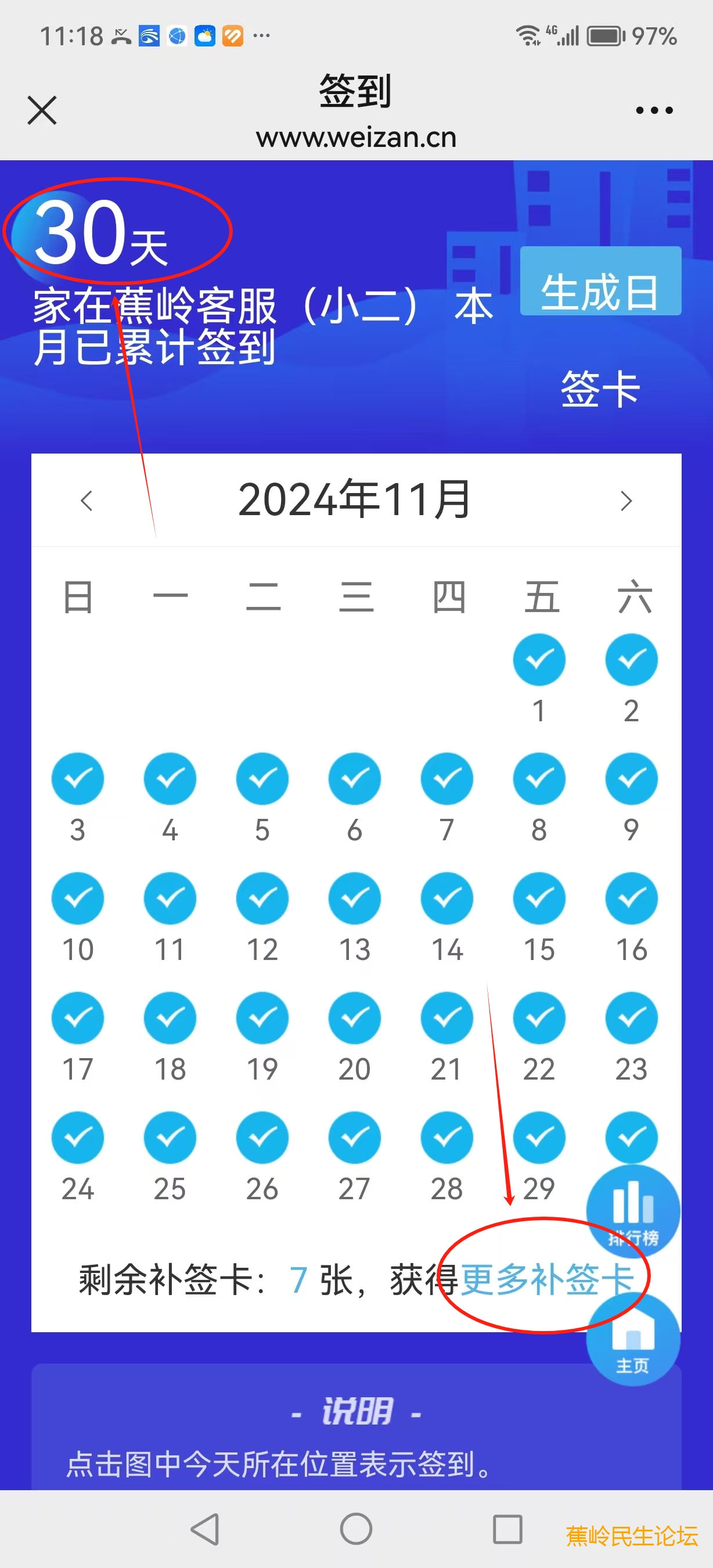 2024年11月签到全勤奖励:回复留言领开心红包+3张补签卡