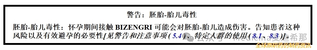 • 建议有生育能力的女性在使用 BIZENGRI 治疗期间以及最后一次服药后 2 个月内采取有效的避孕措施。
