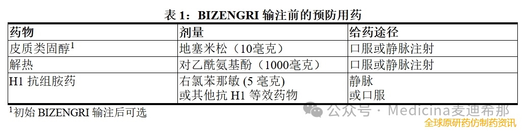 每次输注 BIZENGRI 之前,均应使用预先用药以降低输注相关反应 (IRR) 的风险(见表1)。