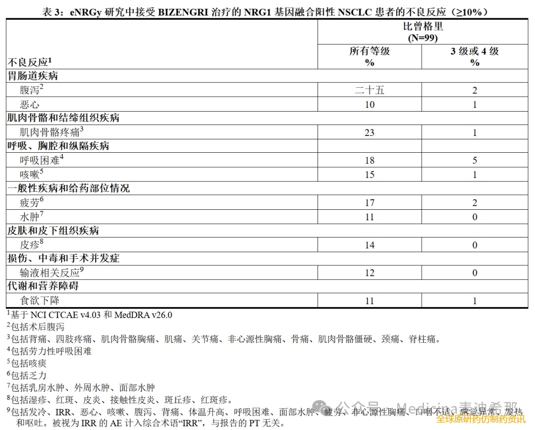 表3总结了eNRGy研究中NRG1基因融合阳性不可切除或转移性NSCLC患者的不良反应。