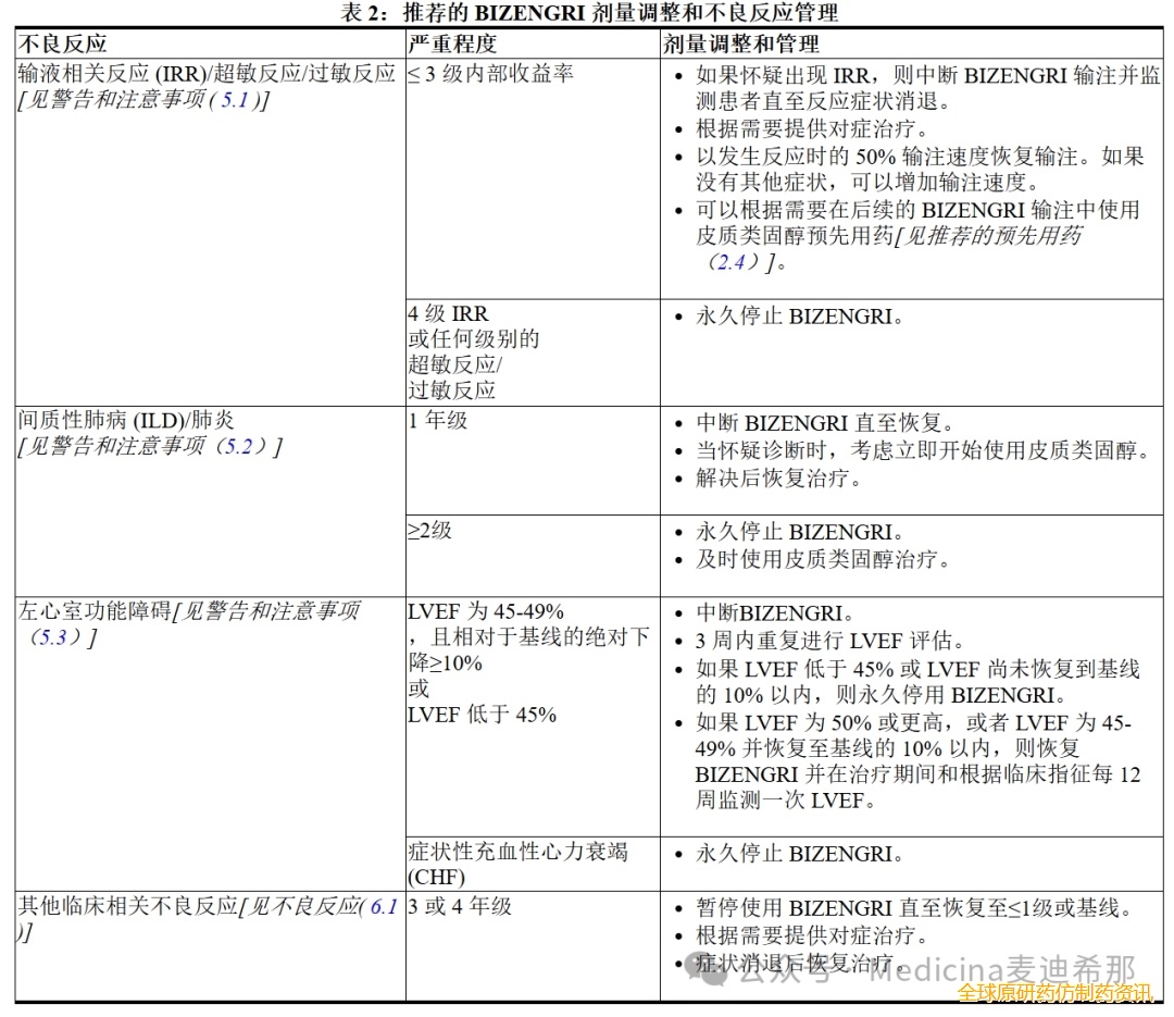 不建议减少 BIZENGRI 的剂量。表2列出了针对不良反应的 BIZENGRI 剂量调整建议。