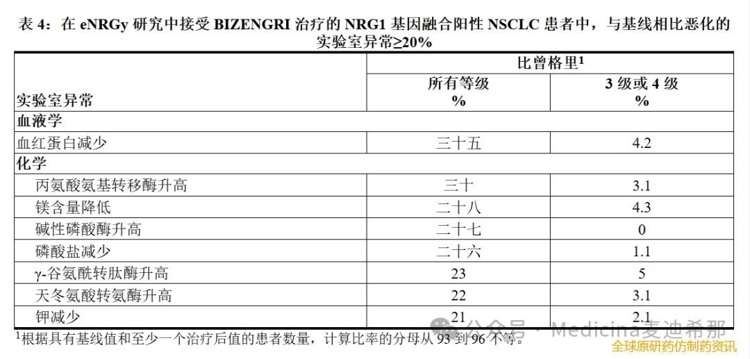 表4总结了 eNRGy 研究中NRG1基因融合阳性的不可切除或转移性 NSCLC患者的实验室异常。