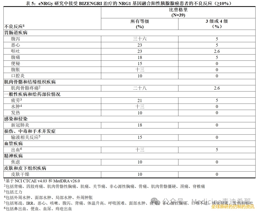 表5总结了eNRGy研究中NRG1基因融合阳性胰腺腺癌患者的不良反应。