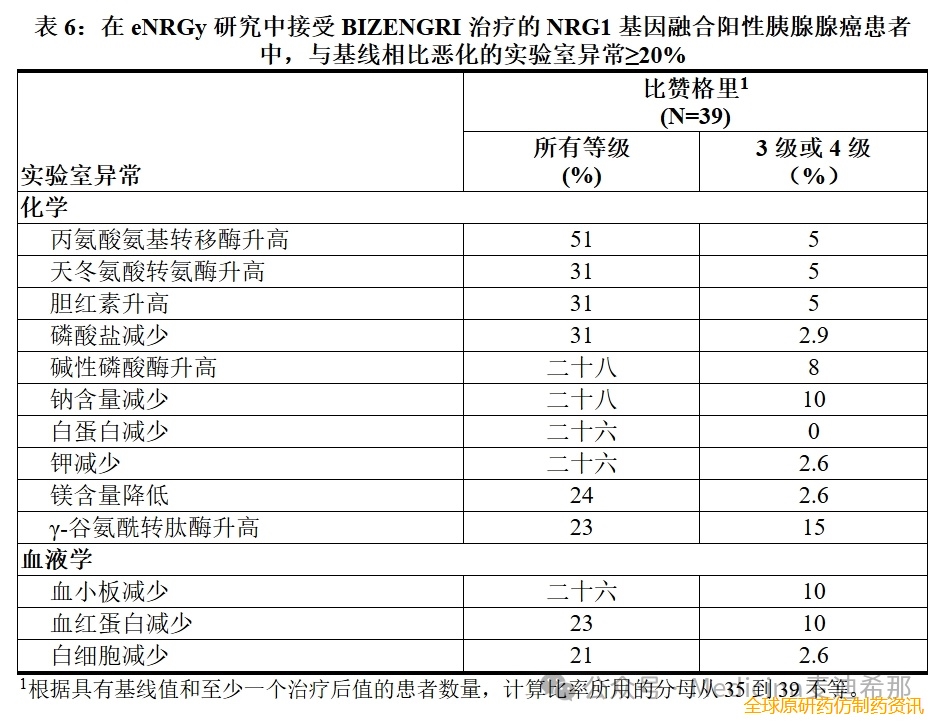 表6总结了NRG1基因融合阳性胰腺腺癌 患者在 eNRGy 研究中发现的实验室异常。