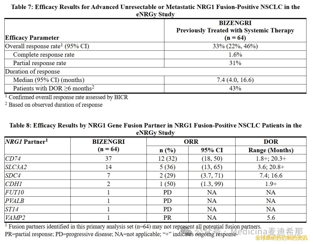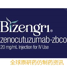 Bizengri的批准基于eNRGy试验的数据。这是一项多中心、开放标签的1/2期临床试验,招募了患有NRG1+胰腺导管腺癌或NRG1+非小细胞肺癌的患者。在NRG1+胰腺导管腺癌患者(n=30)中,Bizengri的总缓解率为40%(95% CI:23%-59%)。缓解持续时间范围为3.7个月至16.6个月。在同一试验中,接受Bizengri治疗的NRG1+非小细胞肺癌患者(n=64)的总缓解率为33%(95% CI:22%-46%)。NRG1+非小细胞肺癌患者的中位缓解持续时间为7.4个月(95% CI:4.0-16.6)。