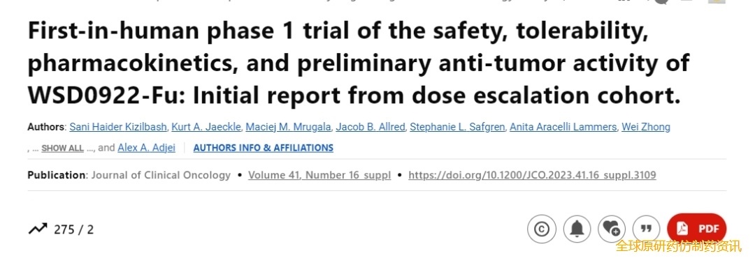 2023年ASCO年会上,研究者报告了 WSD0922-Fu 在EGFR 突变复发性HGA 和NSCLC 患者的首次人体I期剂量递增试验的初步结果。