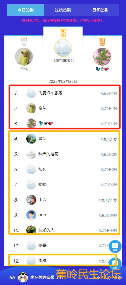 温馨提醒:今天签到榜中奖的红包已经由系统统一派发,请到中奖坛友到论坛首页领取。(因系统只能显示排名榜前100名,凡102、105、105、112、115、118、122、125、128.....请转发链接或截图给:家在蕉岭客服(小二)登记领奖,谢谢!)