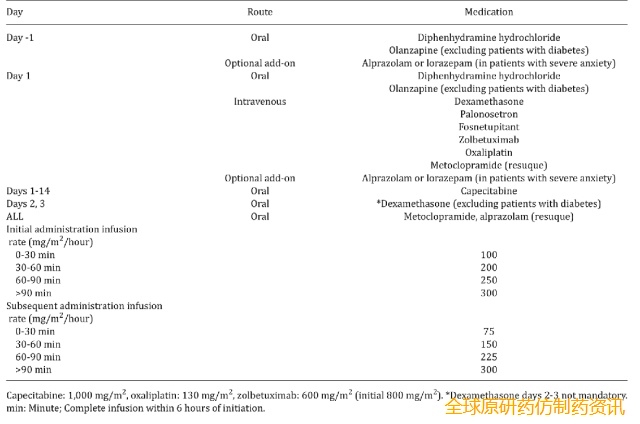表1. 佐妥昔单抗加卡培他滨和奥沙利铂的门诊给药方案。