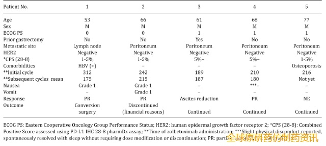 患者特征和治疗方式。2024 年 7 月至 11 月期间,5 名 CLAUDIN18.2 阳性晚期胃癌患者在我们机构接受了门诊佐妥昔单抗治疗。患者年龄中位数为 66 岁(范围 =53-77 岁),其中 100% 为男性。三名患者接受佐妥昔单抗联合 CapeOX 方案作为晚期疾病的从头一线治疗,两名患者因非医疗原因(分别为患者偏好和意外骨折)暂时停止初始治疗后,病情进展后接受佐妥昔单抗作为临床一线治疗。研究人群的基线特征总结在表II中。在 5 名入选患者中,4 名可评估疗效,3 名达到 PR,1 名显示腹水量临床改善。治疗方式显示出显著的成功,并且高度遵守方案。在这五名患者中,一名在第 6 个周期获得反应后进行了转换手术,一名尽管获得了临床反应,但由于经济限制在第 3 个周期后停止治疗,三名患者在数据截止时仍在继续治疗。治疗计划的依从性很高,只有两名患者由于与治疗毒性无关的后勤因素(医生无法到场和患者的工作承诺)而出现延迟(延迟一周和三周)。值得注意的是,没有患者因不良事件或安全问题而需要停止治疗。