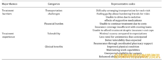 对门诊治疗患者体验的定性分析。我们对常规临床护理期间记录的患者体验进行了定性分析。我们的分析确定了患者体验中出现的两个主要主题:治疗障碍和治疗体验(表III)。在治疗障碍中,交通和财务挑战被提取为主要类别。与交通相关的代码强调了诸如因药物引起的嗜睡而无法驾驶和依赖他人搭车等问题,而与财务障碍相关的代码表明尽管有保险覆盖系统,但仍然存在挑战。