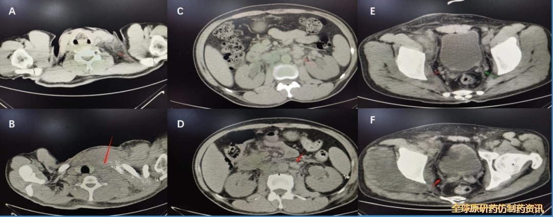 图3. 2023.03.29(A、B)、化疗4个周期(C、D、E、F)胸腹盆CT平扫检查结果