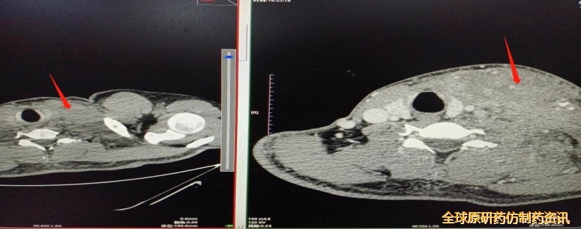 淋巴结彩超:甲状腺未见明显异常;双侧颈部及右侧腋窝肿大淋巴结;左侧腋窝皮下组织较对侧明显增厚,考虑炎性改变,结合临床