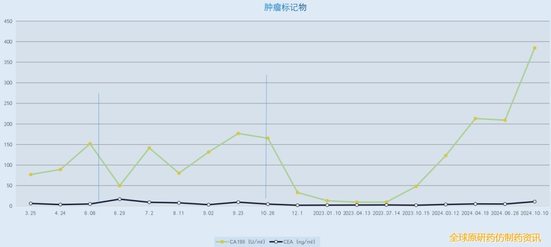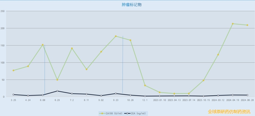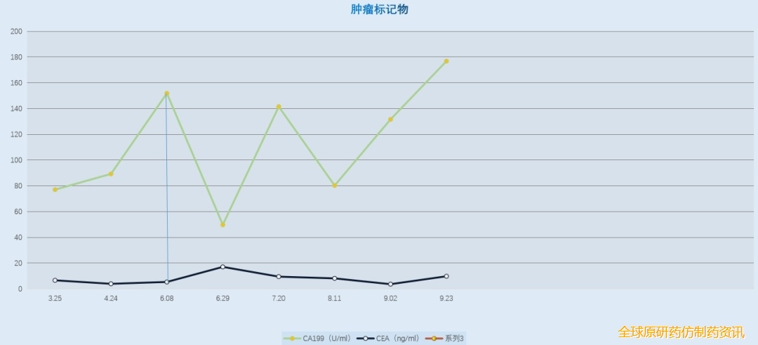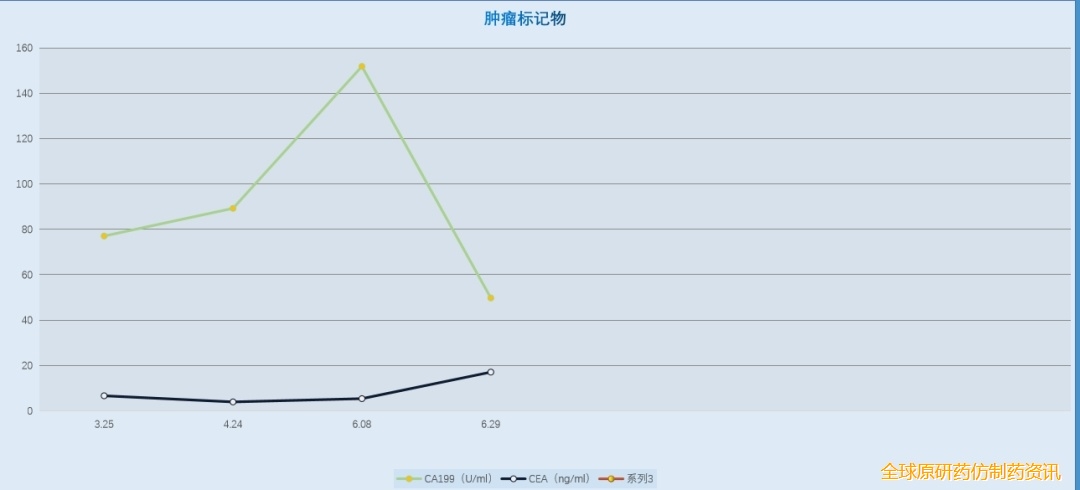 肿瘤标志物:CEA 6.65ng/ml(正常≤5),CA199 77.05U/ml(正常≤37)