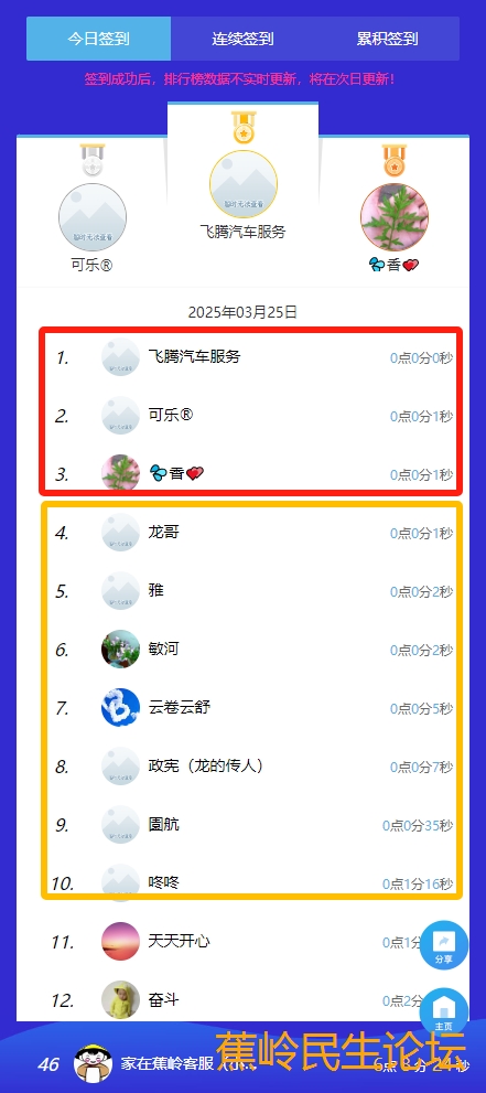 今天(3月25日)农历二月二十六【逢三、六、九为三圳圩日】签到榜排名前十名坛友和签到榜逢3、6、9尾数的奖励开心红包一个。
