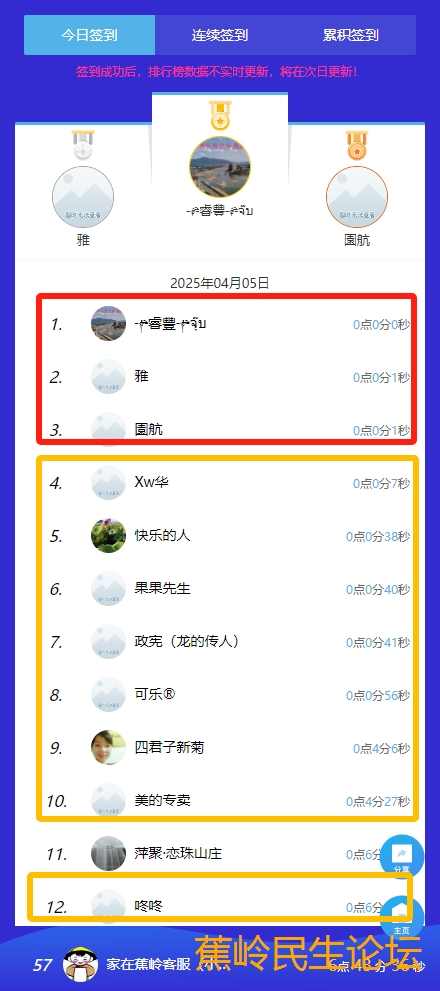 温馨提醒:今天签到榜中奖的红包已经由系统统一派发,请到中奖坛友到论坛首页领取。(因系统只能显示排名榜前100名,凡102、105、108、112、115、118、122、125、128.....请转发链接或截图给:家在蕉岭客服(小二)登记领奖,谢谢!)