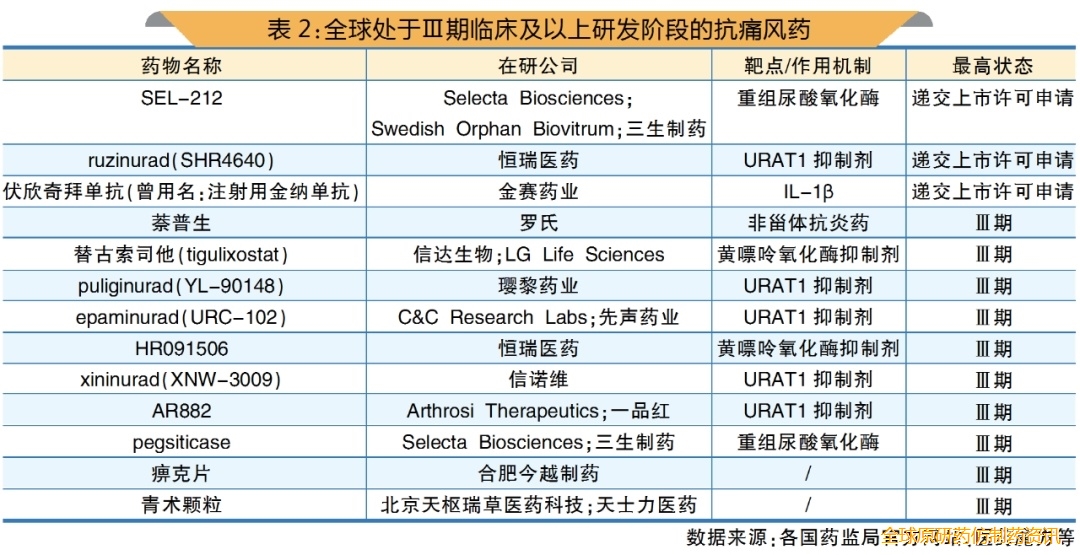 据不完全统计,全球进入Ⅲ期临床研究及以上研发阶段的抗痛风药共13个(递交上市许可申请3个,Ⅲ期10个)。其中,ruzinurad(SHR4640)、puliginurad(YL-90148)、xininurad(XNW-3009)、HR091506、伏欣奇拜单抗、痹克片和青术颗粒7个药物的原研公司为中国本土企业(详见表2)。