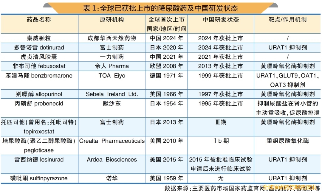全球已获批上市许可的降尿酸药共11个(按活性成份统计,含2个中药创新药),其中7个已在中国获批上市许可(详见表1)。全球已上市的降尿酸药物的药理作用主要有3种:黄嘌呤氧化酶抑制剂、尿酸转运蛋白1(URAT1)抑制剂和重组尿酸氧化酶。
