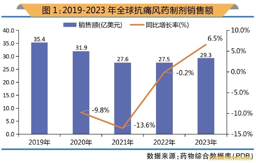 此外,值得注意的是,金赛药业的伏欣奇拜单抗2024年4月向CDE递交了痛风适应症的上市许可申请,获批后将成为国内首个用于治疗痛风急性发作的单抗类药物,这类白细胞介素-1(IL-1)受体拮抗剂已被国内指南推荐用于现有急性期药物(如秋水仙碱等)不耐受的二线痛风急性发作期的治疗,但目前尚无IL-1抑制剂药物在中国获批痛风适应症的上市许可。部分已经进入临床试验阶段的新药理作用降尿酸药也值得关注:如THDBH-151和HZN-457。通化东宝药业自主研发的小分子药物THDBH-151对黄嘌呤氧化酶和URAT1双靶点均有抑制作用,能够在抑制尿酸生成的同时促进排泄,两种作用机制共同降低血尿酸水平,缓解URAT1单靶点抑制对肾脏造成的影响,该药物已完成Ⅱa期临床试验。HZN-457是Arrowhead公司与Horizon公司联合开发的小干扰RNA(siRNA)药物,能够在肝脏静默嘌呤代谢路径中黄嘌呤脱氢酶的表达,抑制尿酸生成。近年来,全球抗痛风药稳定在约30亿美元的市场规模,已上市药品的作用机制和靶点相对集中,暂无突破性疗法上市,新药理作用的抗痛风药的研发还未进展至后期临床研究阶段。新型抗痛风药如URAT1抑制剂、IL-1抑制剂近期已在国内获上市许可,或递交上市许可申请,预计不久将在国内上市,为中国痛风患者提供新的治疗选择。当前,全球抗痛风药销售额基本保持稳定(见图1),据药物综合数据库(PDB),2023年全球抗痛风药制剂销售额约29.3亿美元,相较上一年增长6.5%,2019-2023年复合年增长率-4.6%。2023年全球抗痛风药制剂销售额排名前三的药物分别为培尿酸酶(11.0亿美元)、非布司他(6.8亿美元)和别嘌醇(4.5亿美元)。