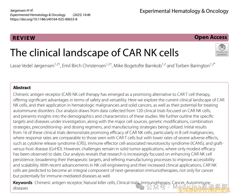 嵌合抗原受体 (CAR) NK 细胞疗法已成为 CAR T 细胞疗法的一种有前景的替代方案,在安全性和多功能性方面具有显著优势。本文,我们探讨了 CAR NK 细胞的当前临床前景、其在血液系统恶性肿瘤和实体癌中的应用,以及其在治疗自身免疫性疾病方面的潜力。我们的分析基于 120 项 CAR NK 细胞临床试验的数据,并深入分析了这些研究的人口统计学特征。我们进一步概述了正在研究的具体靶点和疾病,以及主要的细胞来源、基因改造、联合策略、预处理和给药方案以及正在使用的生产策略。其中16项临床试验的初步结果显示,CAR-NK细胞疗效显著,尤其在B细胞恶性肿瘤中,其缓解率与CAR-T细胞相当,但严重不良反应发生率较低,例如细胞因子释放综合征(CRS)、免疫效应细胞相关神经毒性综合征(ICANS)和移植物抗宿主病(GvHD)。然而,CAR-NK细胞在实体瘤中的应用仍面临挑战,迄今为止仅观察到有限的疗效。我们的分析表明,研究越来越侧重于增强CAR-NK细胞的持久性、拓宽其治疗靶点以及改进制造工艺以提高其可及性和可扩展性。随着NK细胞工程的最新进展及其临床应用的不断增加,CAR-NK细胞预计将成为下一代免疫疗法的重要组成部分,不仅用于治疗癌症,还可能用于治疗免疫介导疾病。