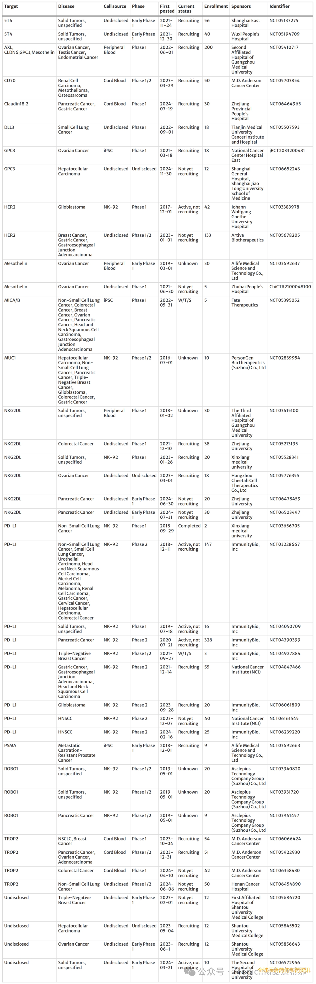 CAR-NK细胞临床试验概述
