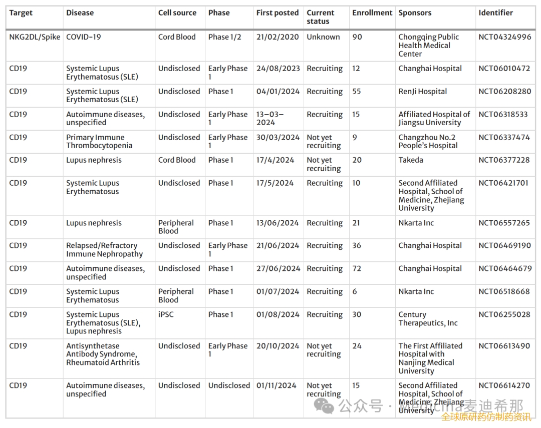 自身免疫性疾病是一组形态各异的慢性炎症性疾病,免疫系统会错误地攻击人体自身的细胞、组织或器官。在各种免疫机制中,B 细胞通常发挥着核心作用,它能够产生自身抗体、向 T 细胞呈递抗原以及释放促炎细胞因子。最近,CAR-T 细胞通过靶向致病性 B 细胞,已成功用于治疗难治性系统性红斑狼疮 (SLE)。在一项研究中,8 名患者接受了 CD19 靶向 CAR-T 细胞治疗,SLE 完全缓解,并且在三个月的随访中,患者的疾病活动指数 (SLEDAI) 维持在 0,且未使用免疫抑制药物。鉴于这些令人鼓舞的结果,研究人员正在积极探索 CAR-NK 细胞等现成的解决方案来治疗自身免疫性疾病。值得注意的是,在 2024 年迄今为止注册的 32 项 CAR-NK 细胞临床研究中,有 12 项正在研究自身免疫性疾病。五项已注册的CAR-NK细胞疗法研究了SLE患者,所有研究均靶向CD19(包括NCT06010472、NCT06208280)。其他正在积极研究的适应症包括原发性免疫性血小板减少症(ITP)、免疫相关性肾病和狼疮性肾炎(NCT06337474、NCT06469190、NCT06377228),所有这些适应症均通过CD19靶向B细胞。