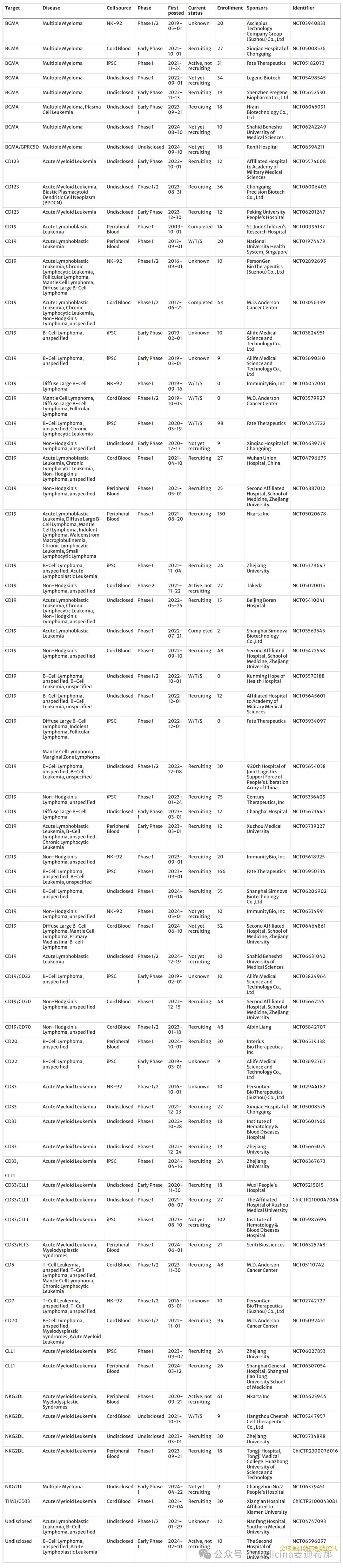 目前,clinicaltrials.gov 上注册了上千项 CAR T 细胞疗法临床试验,现有文献已对其特点进行了全面综述。相比之下,CAR NK 细胞疗法试验相对较少,目前尚无此类试验的全面总结。为了弥补这一差距,我们从多个临床试验数据库收集了数据。这项工作确定了 124 项注册的 CAR NK 细胞疗法试验,详见表 1、2、3和补充表1 ,排除了 4 项因未招募患者而暂停、撤回或终止的试验。数据截止日期为 2024年10月25日。