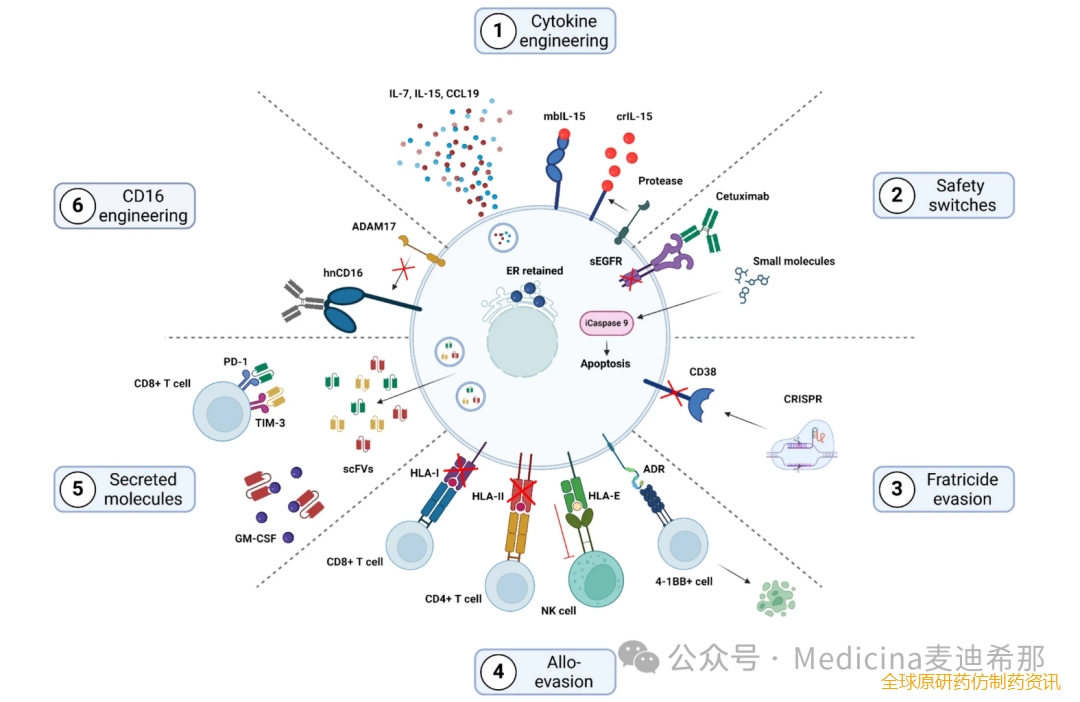 图3 CAR NK 细胞基因修饰示意图。1 .细胞因子修饰增强功能。2 .整合安全开关机制,通过 ADCC 控制细胞凋亡和靶向细胞清除,提高安全性。3 .基因敲除,避免自相残杀。4 .同种异体逃避技术,包括 HLA 修饰。5 .分泌调节分子,调节免疫。6 .工程化 CD16,提高靶向性和细胞毒性。PD-1程序性细胞死亡蛋白 1、TIM-3 T 细胞免疫球蛋白和粘蛋白结构域 3、GM-CSF粒细胞巨噬细胞集落刺激因子、HLA-I人类白细胞抗原-I、HLA-II人类白细胞抗原-II、HLA-E人类白细胞抗原-E、ADR同种免疫防御受体、mbIL-15膜结合 IL-15、ADAM17 A 解整合素和金属蛋白酶 17、hnCD16高亲和力、不可裂解 CD16。