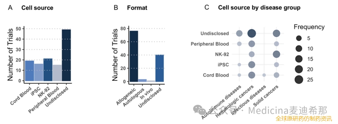 图4 临床试验中研究的细胞来源和形式概览。A图中总结了 NK 细胞的来源。B临床试验的分布情况,基于 NK 细胞是作为同种异体还是自体产品给药。C细胞来源分布在不同疾病组中,气泡尺寸越大表示频率越高。iPSC可诱导多能干细胞。