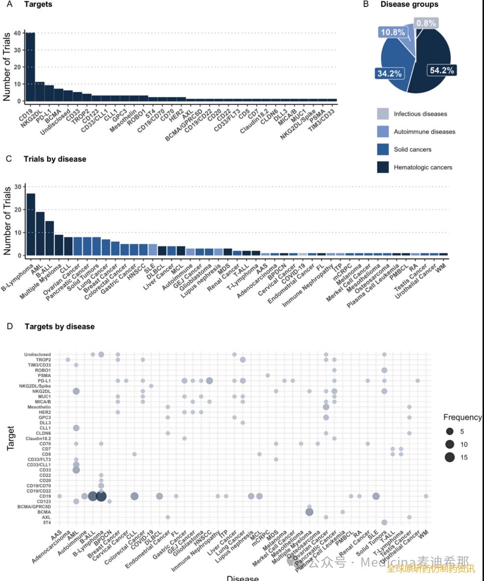 图2 临床试验中研究的靶点和疾病概览。A试验按分子靶点分布,每项试验至少注册一个靶点。双重靶点用“/”分隔。B临床试验中涉及的总体疾病组。C CAR NK细胞疗法^1 所针对的疾病,并按疾病组着色。请注意,一项试验可以注册多种疾病。在首例患者入组前终止的试验未包含在图中。D靶点在不同疾病中的分布情况,气泡尺寸越大表示频率越高。B 淋巴瘤B 细胞淋巴瘤(未指明),AML急性髓系白血病,B-ALL B 细胞急性淋巴细胞白血病,CLL慢性淋巴细胞白血病,DLBCL弥漫大 B 细胞淋巴瘤,MCL套细胞淋巴瘤,HNSCC 头颈部鳞状细胞癌,SLE系统性红斑狼疮,FL滤泡性淋巴瘤,GEJ 癌症胃食管连接部腺癌,MDS骨髓增生异常综合征,自身免疫性自身免疫性疾病,未指明,T-ALL T 细胞急性淋巴细胞白血病,T 淋巴瘤T 细胞淋巴瘤,未指明,BPDCN母细胞性浆细胞样树突状细胞肿瘤,ITP原发性免疫性血小板减少症,mCRPC转移性去势抵抗性前列腺癌,MZL边缘区淋巴瘤,PMBCL原发性纵隔大 B 细胞淋巴瘤、WM Waldenströms 巨球蛋白血症。