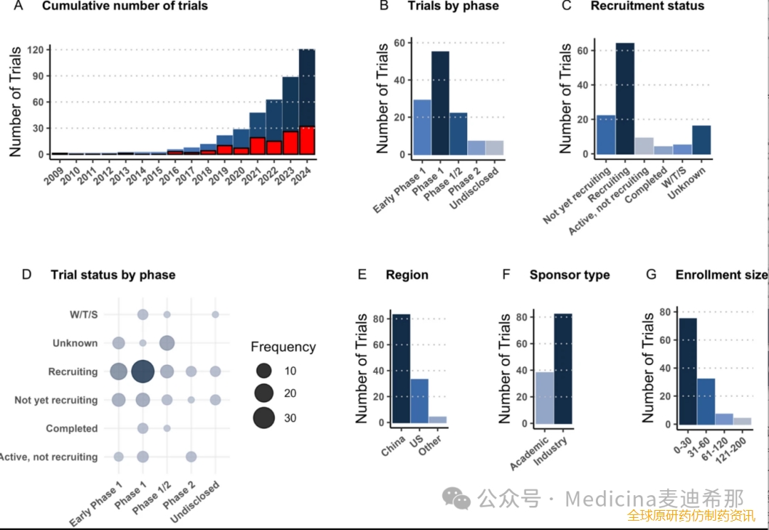 图1 CAR NK 临床试验特征概述。A美国、欧盟、中国和日本注册的试验总数,包括撤回、终止或暂停的试验,但不包括从未招募患者的试验;红色条形代表年度注册量。B按阶段对试验进行分类,clinicaltrials.gov 上部分条目未指定。C招募状态。D按阶段显示试验状态,气泡尺寸增大表示频率较高。E试验申办方的地理来源。F申办方类型,区分学术试验和行业试验。G展示的招募规模范围,未区分实际参与者人数和预期参与者人数。