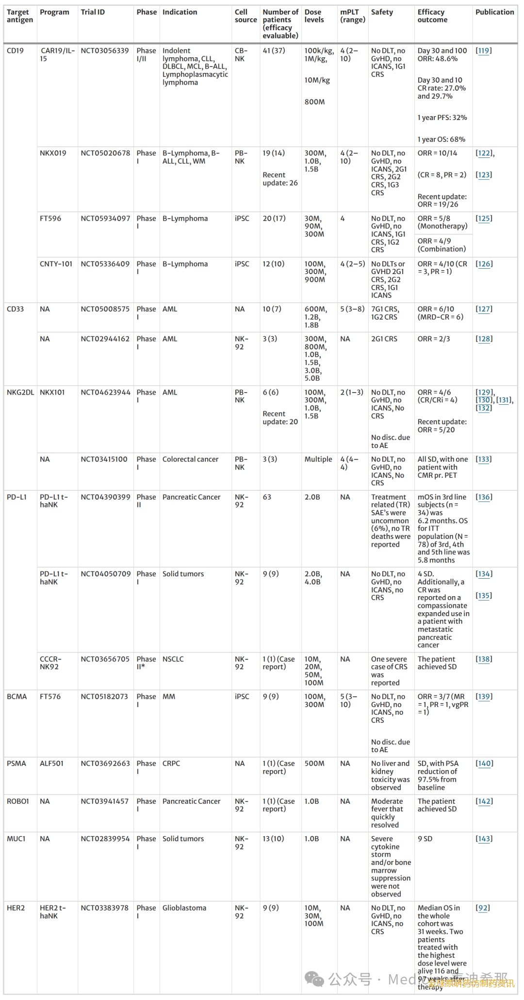 另一种靶向 CD19 的 CAR NK 细胞 NKX019 目前正在一项正在招募患者的临床试验中进行测试,用于治疗 CD19 + B 细胞恶性肿瘤 (NCT05020678)。NKX019 是一种冷冻保存的外周血 (PB) 来源的同种异体 CAR NK 细胞产品,其包含靶向 CD19 的 CAR,该 CAR 使用 OX40 作为共刺激信号结构域,并使用 mbIL-15 增强体内持久性。临床前数据已证明 NKX019 能够在体内和体外快速清除 CD19 + 细胞。在临床试验中,19 名患者纳入了初步评估,包括 14 名 B 细胞淋巴瘤患者和 5 名白血病患者,所有患者均接受过中位数为 4 种既往治疗方案。这些患者接受了不同剂量的 NKX019,包括 3 亿、10 亿和 15 亿个细胞。患者在治疗前接受了 Cy/Flu 淋巴细胞清除预处理。截止时,未观察到剂量限制性肝病 (DLT),也未出现 CRS、ICANS 或 GvHD 病例。疗效在各种组织学类型中均得到证实,8 例患者达到 CR,其中 5 例在单个治疗周期后达到 CR。此外,3 例 NHL 患者随着更多治疗周期的进展,缓解程度从部分缓解 (PR) 加深为 CR。在最高剂量组中,NHL 患者的客观缓解率 (ORR) 为 80%,CR 率为 70%。值得注意的是,5 例患者维持 CR 超过 6 个月,其中 1 例 LBCL 患者维持 CR 超过 9 个月。在最近的数据更新中,纳入了 26 名参与者,ORR 为 73%。值得注意的是,更新的数据来自 4 例在初始 CR 和随后的 PD 后接受再次治疗的患者。仅经过一个周期的重新给药,所有 4 例患者均再次达到 CR,其中 2 例仍保持 CR,凸显了在这种情况下重新给药的潜在疗效。