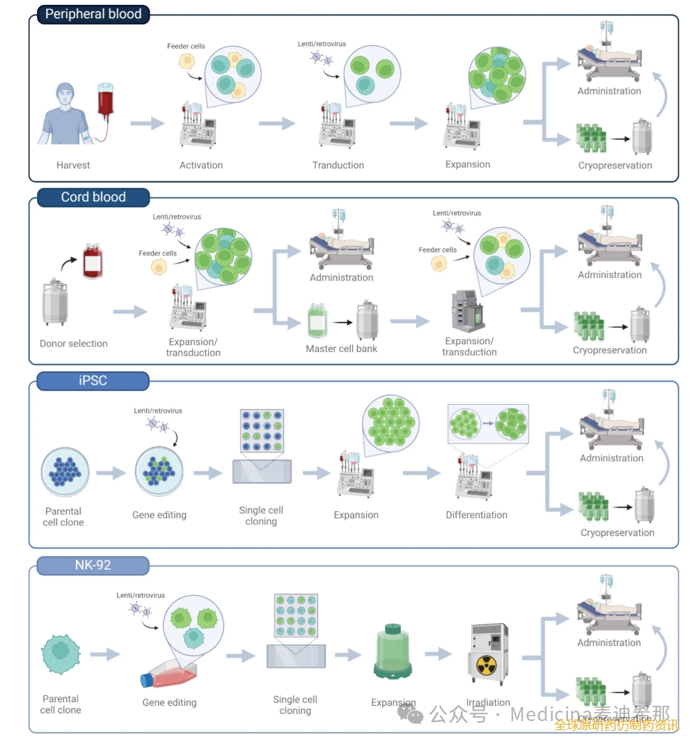 图5 CAR NK 细胞生产策略。CAR NK 细胞的生产方案因起始材料而异。所示生产步骤基于 Nkarta, Inc.(外周血 NK 细胞)、Artiva Biotherapeutics, Inc./Takeda Pharmaceuticals Ltd.(脐带血 NK 细胞)、Fate Therapeutics, Inc.(iPSC NK 细胞)以及学术平台(NK-92 细胞)所采用的平台。iPSC诱导多能干细胞。