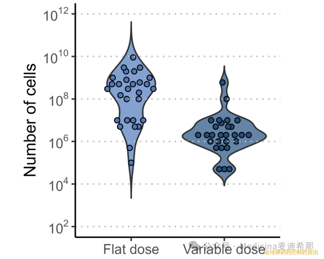 在早期剂量递增研究(1期或1/2期)中,目前正在测试两种给药策略:固定剂量和根据接受者体重调整的可变剂量。图7总结了此开发阶段122项研究中披露的起始剂量,并按疾病组和细胞来源分类。