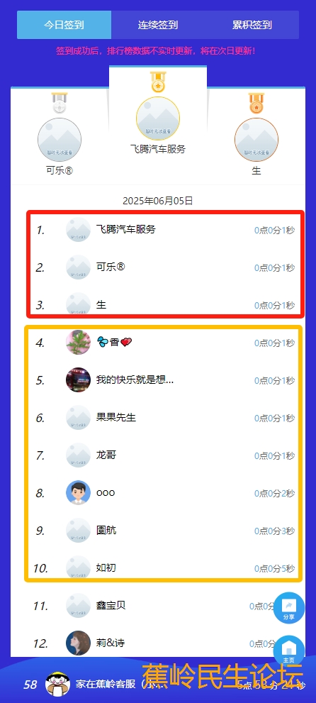 今天(6月5日)农历五月初十【凡尾数是0、5、8的都中奖,0代表今天老历尾数0,5代表老历5月份,8代表大家都发财】签到榜排名前十名坛友和签到榜逢0、5、8尾数的奖励开心红包一个。
