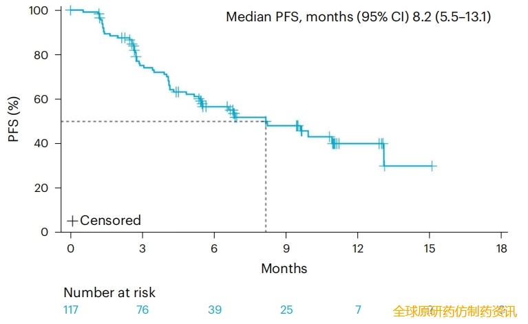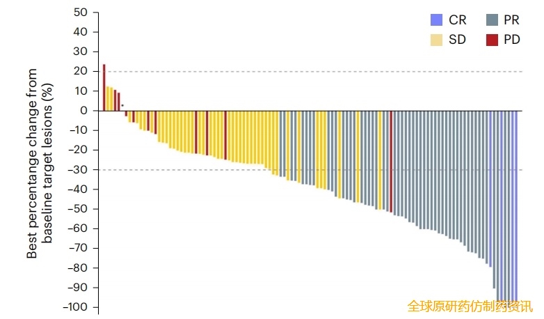 结果显示,在纳入117例患者的全分析集(FAS)中,IRC评估的ORR高达49.6%,30.8%(36/117)的患者缓解深度>50%[3-4](图2)。IRC评估的戈来雷塞治疗的DCR为86.3%(101/117; 95% CI: 78.7%-92.0%)。