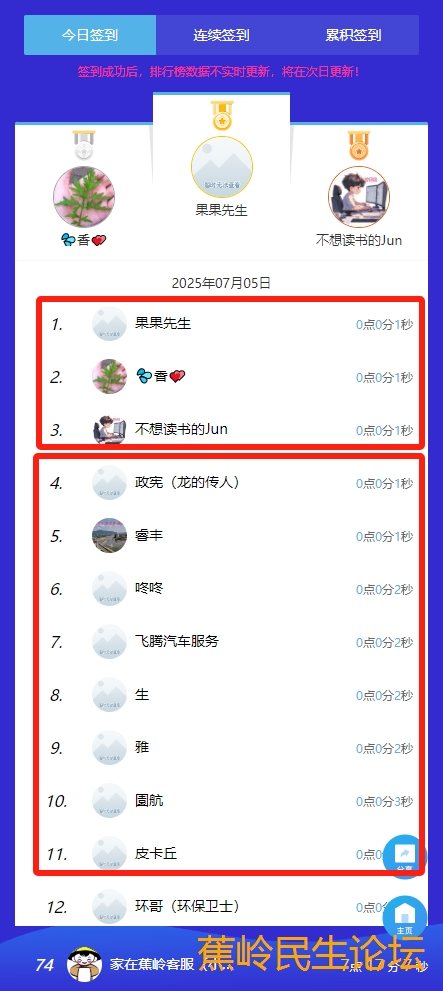 温馨提醒:今天签到榜中奖的红包已经由系统统一派发,请到中奖坛友到论坛首页领取。(因系统只能显示排名榜前100名,凡101、104、107、111、114、117、121、124、127.....请转发链接或截图给:家在蕉岭客服(小二)登记领奖,谢谢!)