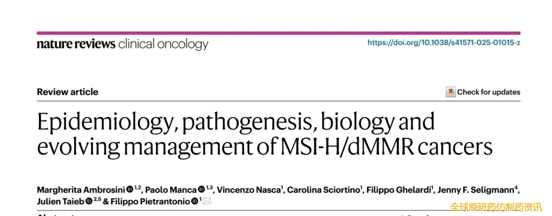 2025年4月,《自然评论临床肿瘤学/nature reviews clinical oncology》杂志(lF:81.1)发表了一篇题为《MSI-H/dMMR癌症的流行病学、发病机制、生物学和不断发展的管理》综述[8](图2)。