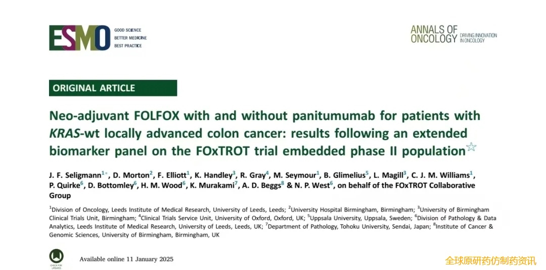 2025 年1月,Seligmann等[15],在《欧洲医学肿瘤学学会官方期刊:肿瘤学年鉴/ESMO:ANNALS OF ONCOLOGY》(IF=56.7)发表了《新辅助方案FOLFOX联合或不联合panitumumab用于KRAS野生型局部晚期结肠癌患者的治疗:基于FOxTROT试验嵌入式随机Ⅱ期人群扩展生物标志物分析结果》的研究报告(图6)。
