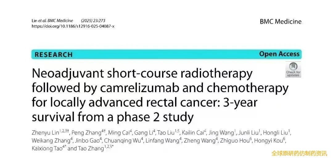 2025年5月,林振宇等[16]在《BMC医学/BMC Med》杂志(IF:7.0)发表题为《新辅助短程放疗后联合卡瑞利珠单抗和化疗治疗局部进展期直肠癌:一项Ⅱ期研究的3年生存数据》研究成果(图7)。