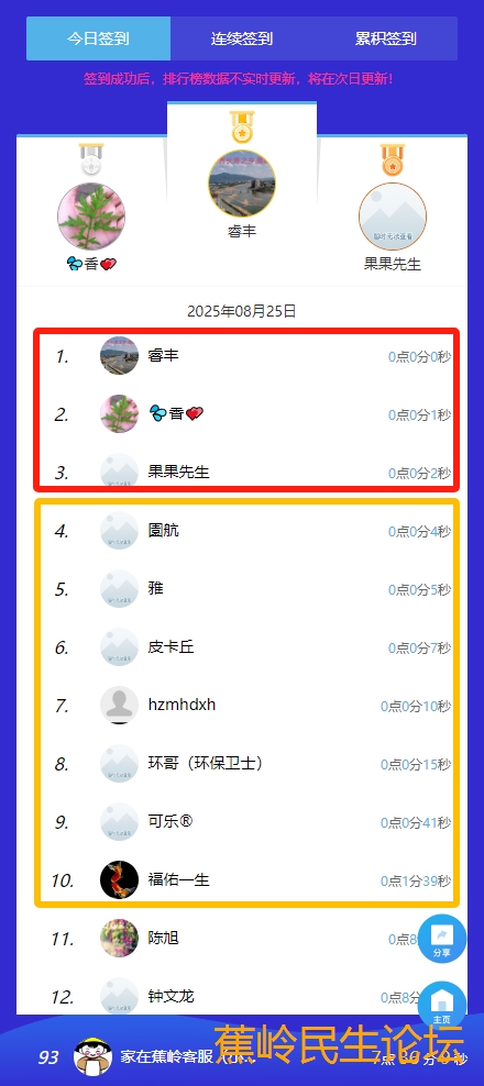 今天(8月25日)农历七月初三【逢三、六、九为三圳圩日】签到榜排名前十名坛友和签到榜逢3、6、9尾数的奖励开心红包一个。