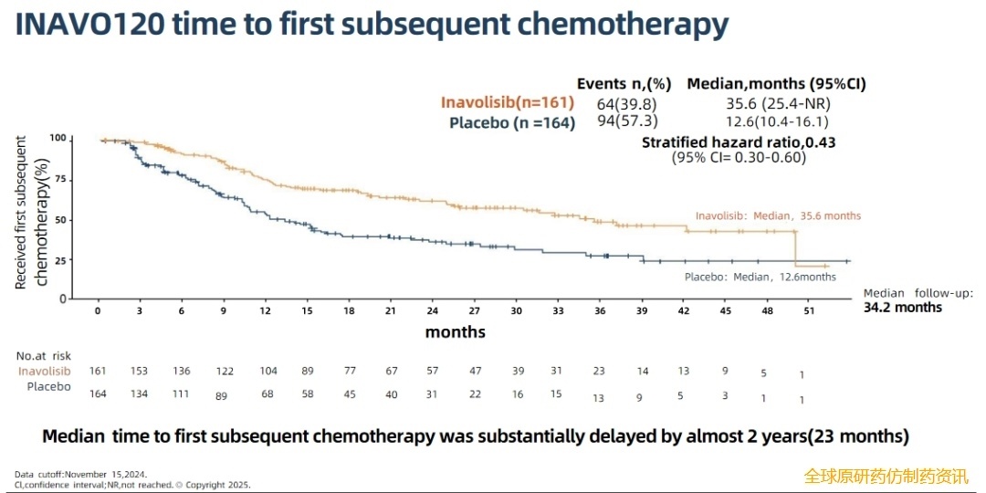 此外,伊那利塞组的中位至首次化疗时间(TFSC)较对照组更长(35.6个月 vs 12.6个月,HR=0.43,95%CI 0.30-0.60),提示伊那利塞三联方案可有效推迟化疗启动时间。