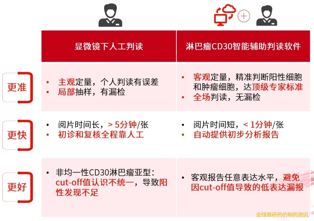 图2 显微镜下人工判读与淋巴瘤CD30智能辅助判读软件辅助人工判读的优缺点