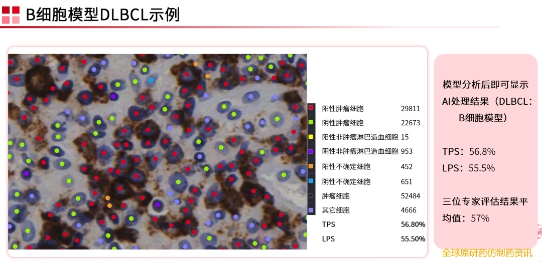 近期,复旦肿瘤医院牵头的国内多中心临床研究建立了包含934例CD30阳性淋巴瘤样本的数字病理云切片库(覆盖9种常见CD30染色方案和9种淋巴瘤亚型),并以专家组判读结果作为金标准,开发了淋巴瘤CD30智能辅助判读软件5。该软件通过深度学习技术,实现了对免疫组化全场图中7类细胞类型(如阳性肿瘤细胞、阴性非肿瘤细胞等)的精准识别与分类定量,并自动计算肿瘤细胞阳性比例分数(TPS)和淋巴样细胞阳性比例分数(LPS),实现了针对异质性表达CD30的淋巴瘤亚型检测结果的精准判读,未来有望助力CD30判读更准、更快、更好5。