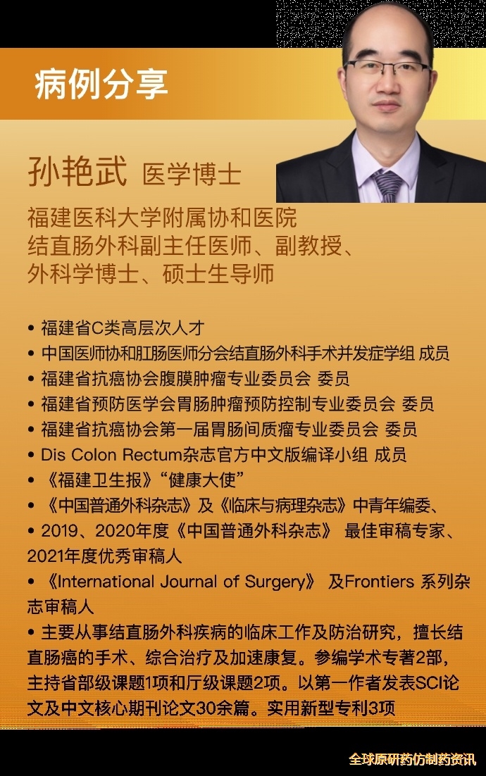 现病史:患者入院前10个月出现反复便血,量少,鲜红,伴里急后重,肛周疼痛,予解热镇痛药后疼痛缓解,近2个月出现体重下降约3kg,1周前肠镜示距肛3-6cm直肠有一溃疡新生物。病理检查为腺癌。