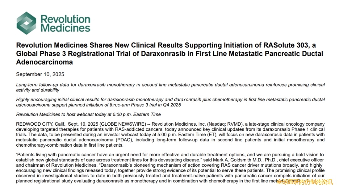 2025年9月10日——Revolution Medicines, Inc.(纳斯达克股票代码:RVMD)一家专注于开发针对RAS成瘾性癌症患者的靶向疗法的晚期临床肿瘤学公司,该公司今天公布了其达拉松拉西布 daraxonrasib(RMC-6236)1期临床试验的关键临床更新。