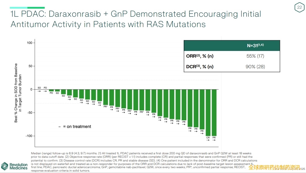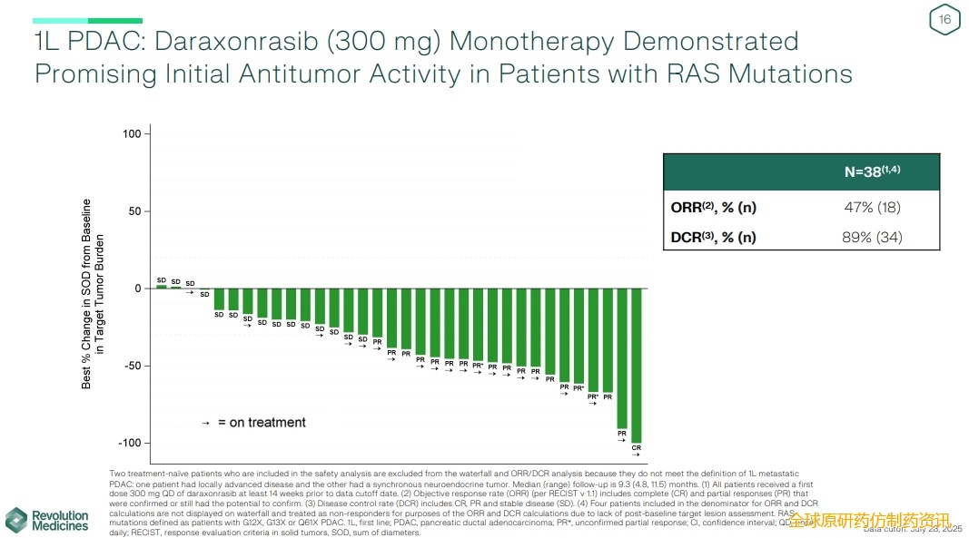截至 2025 年 7 月 28 日截止日期,对接受 daraxonrasib 300 mg QD 单药疗法治疗的未经治疗的 RAS 突变型 PDAC 患者进行了关键安全性和抗肿瘤活性终点评估。