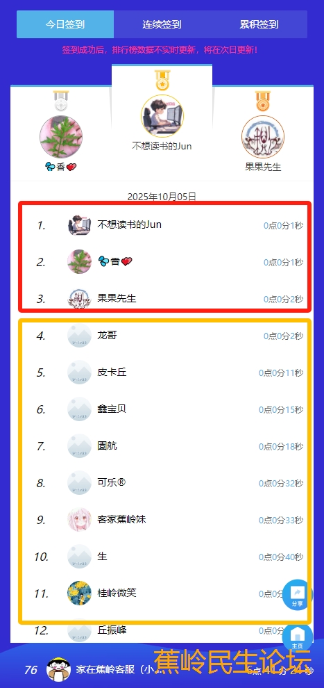 温馨提醒:今天签到榜中奖的红包已经由系统统一派发,请到中奖坛友到论坛首页领取。(因系统只能显示排名榜前100名,凡101、104、107、111、114、117、121、124、127.....请转发链接或截图给:家在蕉岭客服(小二)登记领奖,谢谢!)