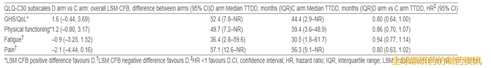 两组中QLQ-C30问卷在基线时的完成率均≥82%。且两组的基线平均得分相近。对于预先设定的子量表,患者在接受辅助治疗前出现了具有临床意义的恶化(评分变化≥10分),随后在辅助治疗阶段恢复至基线水平,且D组与C组之间的CFB无显著差异(见表)。观察到D组的TTDD有延长的趋势(见表)。EQ-5D-5L VAS在基线时的完成率在两组中均≥78%。VAS的基线变化情况与QLQ-C30相似,且两组间无显著差异。