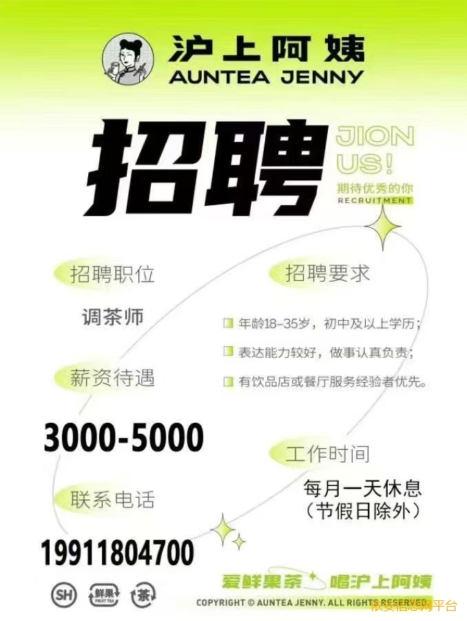 🍀📣沪上阿姨依安店招聘啦!🎉诚聘全职长期茶饮师、有无经验均可。🎉要求:18-35岁,性格活泼,开朗大方,能够服从安排。👀各种节日福利,有发展空间。🎉 上班轮班制,工资3000➕提成电话:19911804700